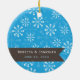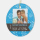 Este adorno de árbol de Navidad presenta un fondo azul con copos de nieve blancos y el marco de la foto para la foto de los recién casados. Una pancarta marrón muestra la frase: Nuestra primera Navidad como Sr. y Sra. La parte trasera tiene el mismo cartel y el mismo texto de personalizable para el nombre de la novia y la fecha de boda.