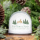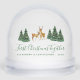 Un diseño navideño con tema de animales del bosque. Hay una pareja de ciervos, un ciervo y una cierva, sobre el fondo de nieve blanca, entre grupos de pinos verdes con nieve a los lados. El texto "Primer Navidad Juntos" está en letra manuscrita verde, con el nombre y el año en letras verdes más pequeñas debajo.