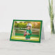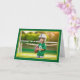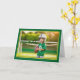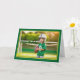 La parte delantera de la tarjeta de cumpleaños de este niño muestra una alegre imagen de un niño vestido con un uniforme de fútbol, incluyendo un casco grande y una camiseta verde con el número "8". El niño sostiene una pelota de fútbol y está parado en un campo con una gran sonrisa feliz en su cara, listo para el partido. El fondo muestra una suave vegetación y un poste de golf, lo que añade un ambiente deportivo a la escena. La tarjeta tiene un borde verde brillante, delineado en amarillo con una textura sutil y juguetona que enmarca la imagen. Las palabras "Feliz cumpleaños" se muestran en la parte superior izquierda con letras verdes en negrita con una ligera sombra negra, dándole al texto un aspecto vibrante y animado. Esta tarjeta es ideal para jóvenes aficionados al fútbol o para cualquier niño que ame los deportes, ofreciendo un divertido y enérgico saludo de cumpleaños. ¡Seguro que traerá emoción a un día especial para un joven atleta!