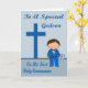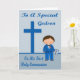 Felicita a tu padrino por su Primera Comunión Santa con un adorable muchacho vestido con un traje azul con corbata de arco y una flor rosa y linda en su solapa sosteniendo una Biblia Santa. El fondo es azul con una cruz azul oscuro y texto.
