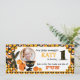 Gato negro rodeado de calabazas con fondo de maíz dulce y guarnecido de rayas con diseño de arco polka-punto negro de aspecto 3D y naranja para un primer cumpleaños de Halloween.