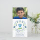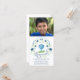 Esta tarjeta de foto de la Primera Santa Comunión incluye una zona de fotos de personalizable, así como un cáliz azul ilustrado y un anfitrión sagrado rodeado de una corona floral y las palabras "Primera Comunión" escritas con un elegante estilo. Ideal para la ocasión religiosa especial de su hijo, puede ser personalizado a su gusto con el nombre de su hijo y la información del evento.