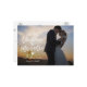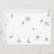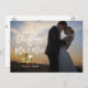 Tarjeta de vacaciones moderna con las palabras "nuestra primera Navidad como Sr. y la señora". en un guión moderno escrito a mano con la foto mostrada detrás. En la parte trasera de la tarjeta hay copos de nieve falsos purpurinas de plata.