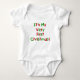 El texto de estilo infantil rojo y verde dice "¡Es mi primera Navidad!" de vacaciones en bolsos de té, trajes para el cuerpo y camisetas para los bebés que están celebrando su primera Navidad.