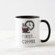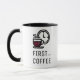 "Primero... café" escrito con una fuente limpia y negra bajo una taza retro de café con un reloj en el fondo. Disponible en muchos estilos y colores, pero prepárelo primero si realiza cambios de diseño para asegurarse de que le gusta.