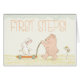 ¡Un bebé dando sus primeros pasos es un hito especial para celebrar! Un oso lindo está empujando a un conejo en un vagón. ¡Tarjeta perfecta para un niño o un chica!