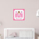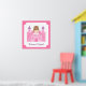 Decoración de una habitación de chica con esta bonita pieza poster, ideal para una habitación con temática de princesa. Tiene una princesa en un vestido blanco y violeta con una tiara rosa en medio de un castillo rosa cartón. Personaliza con el nombre del niño. Paleta de colores alegre y dulce de rosa y morado.