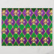 joyas, fondo del Mardi Gras de rhombus violeta y verde, lirios dorados decorados.