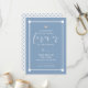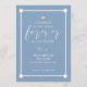 Invitación conmemorativa del bebé en azul suave y mudo con un poco de corazón y texto blanco.