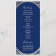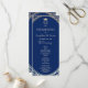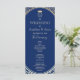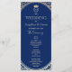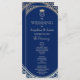 Sencillo, moderno, elegante, caligrafía programa de boda azul marino con marco de arte-deco dorado y monograma real en la parte superior.