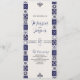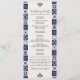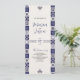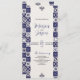 El diseño del Programa Talavera Majolica de la Marina Mexicana de Bodas Blancas Azules muestra un alto diseño vertical con un suave fondo crema enmarcado por baldosas simétricas con estampado azul marino a ambos lados. Las baldosas, inspiradas en los diseños tradicionales de Talavera o Majólica, presentan una gran variedad de motivos ornamentales, como elementos florales, giratorios y geométricos, creando una estética rica, tradicional pero atemporal. En la parte superior e inferior del espacio central se han colocado detalles decorativos mínimos, lo que deja la zona media alargada abierta e ideal para el texto o los detalles del evento.