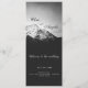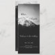 Boda blanco y negro bajo las montañas. Fotografía paisajística de una montaña cubierta de nieve con oscuridad abajo y cielo blanco nublado arriba. Los nombres de la pareja están en letra negra encima de la montaña en el cielo y todos los detalles están en letra blanca debajo de la montaña. Personalizable completo y productos bodas personalizables.