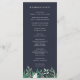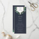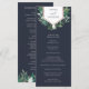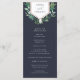 Elegante programa de boda botánico que presenta los detalles de su ceremonia coronados por un elemento geométrico de falso foil de cobre adornado con follaje de acuarela verde y pequeñas flores blancas, con sus nombres en el interior. La parte posterior enumera a los miembros de su fiesta de boda con campos de texto fácilmente editables en blanco sobre un rico fondo azul marino. Se coordina con nuestra colección de invitaciones de boda Greenhouse. Utilice los campos de plantilla para agregar la información de su ceremonia y fiesta de boda, y luego haga clic en "Personalizar" para reposicionar los elementos si es necesario.