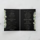 Un programa de boda negro doblado/orden de la ceremonia. Con copos de nieve pintados a mano y eucalipto y una lluvia de puntos. Todo el texto es totalmente editable. Por favor, vea esta Colección en mi tienda para programas con redacción/diseños alternativos y en diferentes tamaños/colores/formas. También disponibles artículos coordinados.