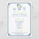 Diseño elegante de un programa de bodas Chinoiserie con jarrones de jengibre pintados a mano y un borde de clave griega.