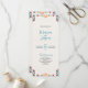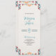 El diseño de este programa mexicano de Fiesta Colorful Botanical Wedding presenta un diseño vertical con patrones florales ornamentales tanto en la parte superior como en la parte inferior, lo que crea un espacio bien enmarcado para el texto en el centro. Los motivos simétricos combinan colores llamativos (como el rojo, el verde azulado, el naranja, el violeta y el amarillo) con flores, hojas y viñas curvas que le dan un aspecto animado y elegante. El fondo central es un blanco roto y suave de textura que ofrece un lienzo perfecto para invitaciones, programas o impresiones decorativas.