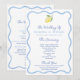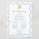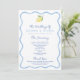 Este diseño de programa de boda relajado y aireado cuenta con un trendy borde boho ondulado azul claro dibujado a mano con un solo limón acuarela en cada página.