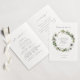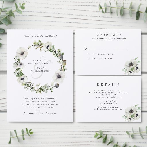 Un hermoso programa de bodas plegadas perfecto para una boda de invierno, con una cortina de flores de color agua de anémonas y vegetación, y una amarre gris claro.