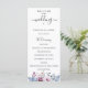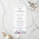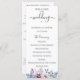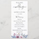 Flores y follaje elegantes de acuarela en azul polvoriento y malva, programa de boda. El programa presenta un acento de caligrafía linda con "boda" y varias líneas para listas de texto personalizadas para el orden de los eventos de la ceremonia, la fiesta de boda y una nota de agradecimiento.