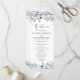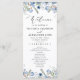 Este elegante Programa de Bodas de nuestra colección Floral Presionada Azul Dusty cuenta con bonitas flores acuáticas con delicados viñedos de vegetación, emparejadas con un moderno tipo de letra de escritura. Perfecto para cualquier temporada. Para realizar cambios avanzados, seleccione Personalizar -> Editar usando la herramienta Diseño.