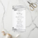 Este elegante y moderno programa de bodas cuenta con acuarelas grises y blancas con bordes superiores e inferiores recortados con purpurinas falsos de plata. El texto aparece en elegantes letras grises de carbón vegetal y fuentes de copperplate en un fondo blanco.