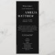 El diseño del programa de bodas es un modelo de sofisticación con su orientación vertical y un sorprendente contraste entre el fondo oscuro y el texto claro. La tipografía audaz usada para los nombres de la pareja se destaca en el fondo, afirmando que es el punto focal. Debajo, un cálido mensaje de bienvenida transita a la lista de eventos de la ceremonia. Cada título de sección se presenta con claridad, utilizando un tipo de letra sans-serif que mejora el aspecto contemporáneo de la pieza. La disposición está muy cuidada y cada parte de la ceremonia está claramente delineada para facilitar la navegación de los invitados. La alineación del texto y el espaciado se diseñan para dibujar la vista hacia abajo a través de la secuencia de eventos sin problemas. Este diseño combina la elegancia tradicional con una sensibilidad moderna, creando una atractiva guía visual para una ceremonia boda.