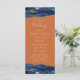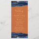 Este elegante y moderno programa de bodas cuenta con una barra de acuarela azul marino con bordes superiores e inferiores recortados con un purpurina de imitación dorada. El texto aparece en elegantes letras de color dorado y fuentes de copperplate en un fondo naranja quemado.