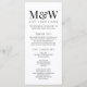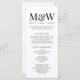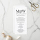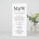 Moderno programa de bodas negras y blancas. Diseño elegante y elegante con texto negro sobre blanco. El frente incluye las iniciales de la pareja, la fecha del boda, la sección de agradecimiento y el programa de la ceremonia. En la parte trasera se muestran los nombres de la fiesta de boda. Personalice con su propio texto frontal y posterior. Todos los colores, textos y tipos de letra se pueden personalizar mediante las herramientas que se proporcionan en los menús de personalización y personalización de Zazzle. Visita nuestra tienda, Austen & Grace, para ver la suite boda completa, productos a juego y más, y por favor contáctanos si necesitas ayuda contact@austenandgrace.com