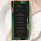 Este elegante y moderno programa de bodas cuenta con acuarela de color verde esmeralda con bordes superiores e inferiores recortados con purpurina de imitación de oro. El texto aparece en elegantes letras de color dorado y fuentes de copperplate en un fondo oscuro.