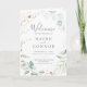 Este amplio programa de bodas plegadas de hojas doradas y vegetación es perfecto para un boda moderno. El elegante diseño botánico presenta un eucalipto de acuarela clara y aireado, acentuado con hojas de purpurina dorada.