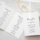 Este sencillo y minimalista programa de bodas dobladas es perfecto para un boda moderno. El diseño, sencillo y elegante, presenta una tipografía de escritura clásica y elegante en blanco y negro. Incluya un presupuesto o mensaje corto, orden de servicio, fiesta de boda y mensaje de agradecimiento.