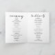 Este moderno y elegante programa de casamiento plegado caligráfico es perfecto para un boda rústico. El diseño, sencillo y elegante, presenta una tipografía de escritura clásica y elegante en blanco y negro. Incluya un presupuesto o mensaje corto, orden de servicio, fiesta de boda y mensaje de agradecimiento.