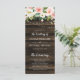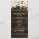 Flores de acuarela elegantes y vegetación decoran estos programas de bodas rústicos. El diseño presenta flores blancas y rosas claras con luces de hilo y un fondo de madera oscura de granero con un tipo de letra de escritura moderno.