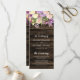 Elegantes flores de color púrpura de lavanda y vegetación decoran estos rústicos programas de bodas. El diseño presenta flores con luces de cuerdas y un fondo de madera oscura de granero con un tipo de letra de escritura moderno.