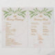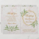 Un programa de bodas plegadas muy moderno que combina múltiples tendencias: geométrica, mármol y metálica (oro). El fondo es de mármol blanco. Tiene decoraciones de hojas de sauce verdes y un hexágono de oro irregular alrededor del texto en la tapa delantera, con hojas de sauce sobre él, arriba a la izquierda y abajo a la derecha. También hay pares de ramas de sauce con hojas verdes en el borde superior, dentro y debajo del texto de la cubierta trasera. El texto tiene un color dorado, como el hexágono de oro, y los títulos y nombres de la novia y el novio están escritos en un elegante guión caligráfico. Tiene la ceremonia del boda y la fiesta de la boda por dentro y un mensaje de agradecimiento en la portada trasera. Las ramas de sauce son del patrón vintage de papel pintado "Willow Bough" diseñado por William Morris (1834-1896 ), ahora de dominio público.