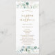 Este programa de bodas presenta eucalipto de acuarela pintada, hojas botánicas verdes y purpurinas doradas con escritura dorada.