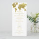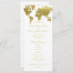 El elegante diseño de la tarjeta de programa de ceremonia de boda inspirado en el viaje vintage presenta un diseño de borde de mapa mundial con un aspecto de brillantes dorados de champán metálico. Personalice el texto del personalizado con el nombre de la novia y del novio, la fecha del boda, la información de la ceremonia, la fiesta de la novia y el mensaje de agradecimiento.