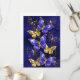 Composición de lujosas mariposas de zafiro y joyas de oro sobre fondo de textura azul.