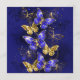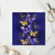 Composición de lujosas mariposas de zafiro y joyas de oro sobre fondo de textura azul.
