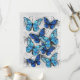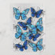 Composición vertical de mariposas morfo realistas, azules y blancas sobre fondo texturado gris. Mariposa morfo azul.