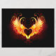 Ángel dispara el corazón con las alas flameantes sobre fondo negro.
