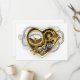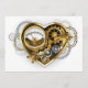 Corazón mecánico, volumétrico, de vapor punk con manómetro de presión, acero y engranajes dorados sobre fondo blanco. Estilo Steampunk.