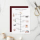 Elementos de la boda ilustrados con acuarela colorida rústica, programa de cronología. La tarjeta incluye iglesia, cámara, botella con vaso, cubiertos, notas musicales, pastel, ramo floral de otoño y coche retro. La parte trasera de la tarjeta tiene un color de fondo rojo burgundy rústico.
