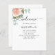 Fondo blanco y elegante, decorado con un color dorado subió y una florida colorida rosa, vegetación eucalipto, follaje dorado. Personalice y agregue sus nombres y la cronología del día de la boda.
