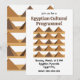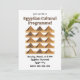 Invitación al Programa Cultural del Patrón de las Pirámides Egipcias originalmente diseñado por Nisha Prabhu. Totalmente personalizable. Personalice con sus datos. Diseño Visualmente Impactante: Las icónicas pirámides y motivos jeroglíficos captan inmediatamente la atención, estableciendo un tono elegante y culturalmente rico para su evento. Importancia Cultural: Con la imagen atemporal del antiguo Egipto, la invitación refleja un tema de historia, misterio y sofisticación, haciendo que su evento se sienta especial y memorable. Atractivo Único y Temático: Perfecto para festivales culturales, programas educativos o fiestas temáticas, ayuda a transmitir el enfoque y la atmósfera del evento de manera efectiva.