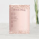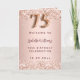 Un fondo con gradiente dorado con brillo falso. El nombre está escrito con un estilo de letra a mano moderno de color rosa dorado oscuro. El número 75 está escrito con una fuente de estilo globo, letra cursiva. Texto de bienvenida, foto, programa y biografía en la parte posterior.