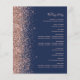 El borde izquierdo de este elegante y moderno programa de bodas cuenta con un rosa de purpurina de imitación de oro. El texto del personalizable combina la escritura a mano brillante rosa rosa y las fuentes de copperplate en un fondo azul marino.