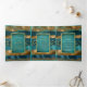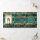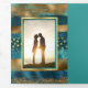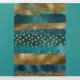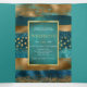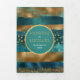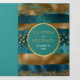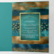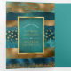 Programa de boda tríptico con pinceladas doradas y azul teñido, y confeti. Este hermoso diseño presenta pinceladas en azul teñido y dorado y confeti. Su texto está en un marco azul teñido con borde dorado. Es perfecto para una boda de otoño o invierno.