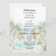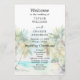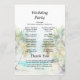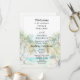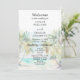 Este elegante y hermoso programa de bodas acuáticas cuenta con una playa, un cielo azul y palmeras. El texto combina guiones manuscritos y sans serif para un estilo elegante y moderno. Es perfecto para una boda de verano o destino tropical.