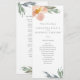 Esta elegante tarjeta de programa de boda botánico presenta hojas y flores pintadas a la acuarela. Las flores y el follaje están realizados en tonos suaves de naranja, verde y gris sobre un fondo blanco crujiente. Los nombres de la novia y el novio y el cronograma del programa de la boda están en una fuente moderna clásica sin serif. Este diseño a doble cara es una elección elegante y bohemio chic para bodas de primavera, verano, otoño o invierno. Diseñado por Victoria de VG Invites. Para ver más, visite www.zazzle.com/vginvites